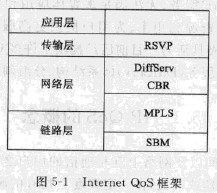 Internet已逐步由單一的數據傳送網向數據、語音、圖像等多媒體信息的綜合傳輸網演化。而現有的傳輸模式仍只能為單一的數據傳送做好服務,無法滿足多媒體應用和各種用戶對網絡傳輸質量的不同要求。因此,為用戶提供服務質量成為Internet發展的重要目標。目前IETF已經提出了許多服務模型與機制來滿足QoS需求,典型的有:綜合服務/資源預留(IntServ/RSVP,IntegratedService/Resource Reservation Protocol)、區分服務(Diff-Serv,Differentiated Services)、多協議標記交換協議(MPLS,Multiprotocol Label Switching)、流量工程(Traffic Engineering)、約束路由(CBR,Constraint-basedRouting)、子網帶寬管理(SBM,Subnet Bandwidth Manager)IntServ/RSVP是在數據傳送前,先進行網絡資源的協商預留。DiffServ則對數據流進行分類,不同的類在網絡中得到不同的服務。MPLS是一種新的路由轉發機制,CBR根據QoS參數的要求和策略選擇路由,流最規劃可以避免網絡中的擁塞問題。SBM提供了數據鏈路層的資源預留。這些協議從不同的層次上提供了QoS的支持,組成了圖5-1所示的QoS框架。