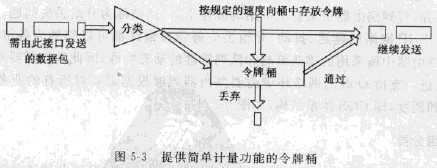 管制和標記共享一個公共的部件一個用于確定一個分組是否超出業務量描述的計董功能。最簡單的例子是令牌桶計量器(見圖5-3),它允許一個特定業務設類的較小程度的突發,但通常執行一個較低的長期(平均)速率限制。令牌以一個固定的速率(每秒令牌數)添加到桶里.無論何時,當一個分組到達時從桶中取出令牌。