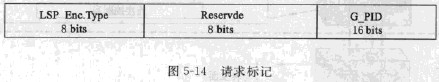 請求標記用于LSP路徑的建立,由LSP上游節(jié)點發(fā)出,向下游節(jié)點申請建立LSP的資源。與MPLS相同,GMPLS的LSP建立過程也是由上游節(jié)點向目的端發(fā)出“標記請求消息”,目的端返回“標記影射消息'所不同的是標記請求消息”中需要增加對所要建立的LSP的說明,包括LSP類型(PSC.TDMC等)、載荷類型等^其格式如圖5-14。