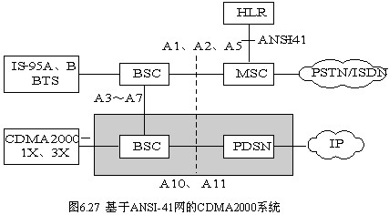 (多載波)無線接口的標準。A接口在原來的基礎上新增加了支持移動IP的A10、A11協議,核心網部分則引入新的分組交換節點PDSN接入IP網絡,以支持IP業務,同時電路型業務仍然由原來的MSC支持,如圖6.27所示。