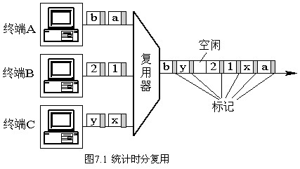 我們來看看具體的工作過程。來自終端的各分組按到達的順序在復用器內(nèi)進行排隊,形成隊列。復用器按照FIFO的原則,從隊列中逐個取出,并向線路上發(fā)送。當存儲器空時,線路資源也暫時空閑,當隊列中又有了新的分組時,進行發(fā)送。圖7.1中,起初A用戶有a分組要傳送,B用戶有1、2分組要傳送,C用戶有x分組要傳送,它們按到達順序進行排隊:a、x、1、2,因此在線路上的傳送順序為:a、x、1、2,然后終端均暫時無數(shù)據(jù)傳送,則線路空閑。后來,終端C有y分組要送,終端A有b分組要送,則線路上又順序傳送y分組和b分組。這樣,在高速傳輸線上,形成了各用戶分組的交織傳輸。這些用戶數(shù)據(jù)的區(qū)分不是像同步時分復用那樣靠位置來區(qū)分,而是靠各個用戶數(shù)據(jù)分組的“標記”來區(qū)分的。