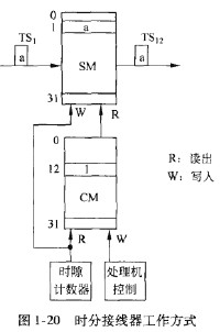 圖1-20中的T接線器的輸入和輸出線都是具有32個時隙的PCM復用線,則SM和CM的存儲單元數均為32。如果用戶A占用時隙KTSJ,用戶B占用時隙12(TS12),現A、B兩個用戶要相互通話。在A講話時,就應該把TSi上的話音信息a交換到TS12上去。那么當時隙計數器計數到1時,就將信息a寫入SM的1號單元內;該信息a的讀出受CM的控制,必須在第12個時隙到來時讀出,因此由處理機在CM的12號單元中寫入1。當第12個時隙到來時,從CM的12號單元中讀出“1”,它是SM的讀出地址,立即讀出SM第1號單元中的信息a,將a放到輸出線上,從而完成了把TS,中的語音編碼信息a交換到TSI2中去的任務。