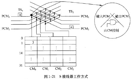 圖1-21中有4條PCM復用線,每條PCM復用線上有32個時隙。對應每一條輸入PCM復用線有一個CM,所以共有4個(^(0^~0^3)。以占據TSi時隙的話音信息a從PCM,線上經過S接線器后交換到PCM3線上為例,在TS,時,處理機在CM。的第1號單元中寫人3,即CM的單元號與時隙號相對應,CM的單元中寫入的內容是輸出PCM復用線的線路號。之后在每幀的時間內,CM。控制交叉點“03”(輸入線PCM。與輸出線PCM3的交叉點)閉合,就把輸入PCM。,TS,中信息a傳輸至輸出PCM3、TS,中去,實現了線路交換。