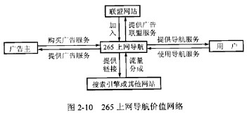265上網導航的價值網絡以265上網導航M站為核心,涉及265提供的分類導航服務、使用265分類異航服務的用戶、265提供的廣告聯盟服務、加入265廣告聯盟服務的廣告主、加入265廣告聯盟服務的M站、在265分類導航上建立連接的搜索引擎和其他網站,它們之間的關系,如圖2-10所示。