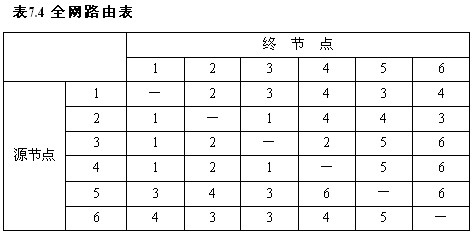 下面給出固定路由表算法的例子。圖7.18(c)為網(wǎng)絡(luò)結(jié)構(gòu),表7.4為網(wǎng)絡(luò)控制中心計(jì)算得到的全網(wǎng)的路由表。該表列出了所有節(jié)點(diǎn)到各個(gè)目的節(jié)點(diǎn)所確定的發(fā)送路由。實(shí)際上,對(duì)于每一個(gè)網(wǎng)絡(luò)節(jié)點(diǎn)僅需存儲(chǔ)其中相應(yīng)的一列即可。圖7.18(a)、(b)分別為節(jié)點(diǎn)1和節(jié)點(diǎn)4的路由表。
