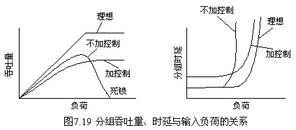 擁塞將會導(dǎo)致網(wǎng)絡(luò)吞吐量的迅速下降和傳送時延的迅速增加,嚴(yán)重影響網(wǎng)絡(luò)的性能。圖7.19表示網(wǎng)絡(luò)阻塞對吞吐量和時延的影響,同時也表示網(wǎng)絡(luò)阻塞對數(shù)據(jù)流施加控制之后的效果。在理想情況下,網(wǎng)絡(luò)的吞吐量隨著負(fù)荷的增加而線性增加,直到達(dá)到網(wǎng)絡(luò)的最大容量時,吞吐量不再增大,成為一條直線。