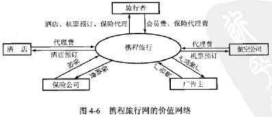 攜程旅行網(wǎng)的利益相關(guān)者主要包括旅行者(企業(yè)、個(gè)人)、酒店(賓館)、航空公司、保險(xiǎn)公司、廣告主(如旅游景點(diǎn)等),其價(jià)值網(wǎng)絡(luò)如圖4-6所示。