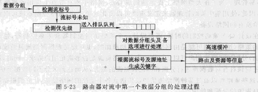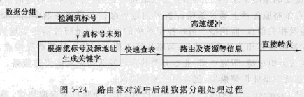 對以后接收到的具有同一流標號的數(shù)據(jù)分組,路由器根據(jù)該流標號及源地址生成高速緩沖流標號狀態(tài)信息査詢關(guān)鍵字,找出髙速緩存中的相關(guān)流標號的狀態(tài)信息,并根據(jù)該流標號狀態(tài)信息決定數(shù)據(jù)分組的路由并直接轉(zhuǎn)發(fā),而不對數(shù)據(jù)分組的其余內(nèi)容進行檢測和處理,也無需排隊等待,其過程如圖5-24所示。