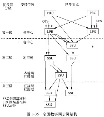 我國數字通信網采用等級主從同步方式,目前網同步的等級分為3級,全網按省、自治區、直轄市劃分為31個同步區,每個同步區設置一個一級基準源時鐘,下設二、三級同步節點時鐘,如圖1-36所示。