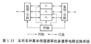 采用這種方式實現多速率電路交換的交換設備,其交換網絡是由多個不同速率的子交換網絡疊加而成,每個子交換網絡專門完成相應基本信道速率的交換圖1.13所示為采用多種基本信道速率的多速率電路交換系統。從各個端口來的信息經復用/分路進入不同速率的信道,不同速率的信道分別連到相應的子交換網絡上,在該圖中有三個子交換網絡分別完成