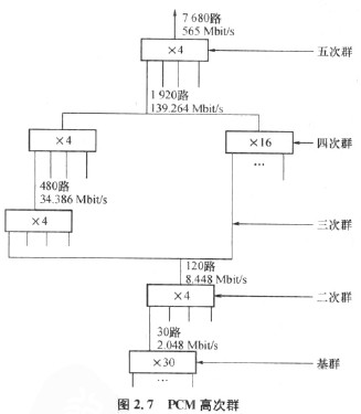 在時分多路復用系統中,高次群是由若干個低次群通過數字復用設備匯總而成的。對于32路PCM系統來說,其基群的速率為2048Kbit/s,其二次群則由4個基群匯總而成,速率為8448Kbit/s,話路數為4X30=120話路。對于速率更高、路數更多的三次群以上的系統,目前國際上尚無統一的建議標準。作為一個例子,圖2.7中介紹了歐洲地區采用的各個高次群的速率和話路數。我國信息產業部也對PCM高次群做了規定,基本上和圖2.7相似,區別只是我國只規定了一次群至四次群,沒有規定五次群。