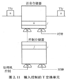 采用輸人控制方式的T交換單元如圖2.11所示。仍然以輸人TS/與輸出TS7的交換為例。當輸入TS/到來時,讀出控制存儲器第i個單元的內容)以此作為話音存儲器的寫人地址,于是在話音存儲圖2.11輸入控制的T交換單元處理機器第)個單元中寫入了輸入TS/的內容a。話音存儲器是順序讀出,當輸出TS)到來時,就讀出第j個單元的內容a,從而完成了所需的時隙交換。