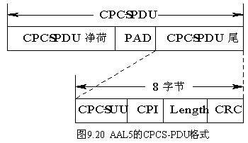 用戶到用戶(UU:User to User)字段不用于AAL層本身,是供更高一層(可能是會(huì)聚子層的特定服務(wù)子部分)使用。例如,排序或者多路復(fù)用占1字節(jié)。1字節(jié)的CPI為公共部分指示,作用是將CPCS-PDU尾湊成8個(gè)字節(jié)。長度(Length)字段指出真正的有效載荷是多少,以字節(jié)為單位,不包括填充的字節(jié)數(shù)。0值用于終止未傳送完畢的報(bào)文。CRC字段是基于整個(gè)報(bào)文的標(biāo)準(zhǔn)32位校驗(yàn)和,包括填充數(shù)據(jù)和尾部信息。AAL5的CPCS-PDU格式見圖9.20。