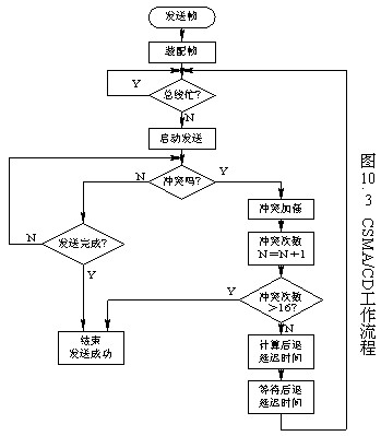CSMA/CD的發(fā)送流程可簡單地概括成四點:先聽后發(fā),邊發(fā)邊聽,沖突停止,隨機延遲后重發(fā)。其流程見圖10.3。