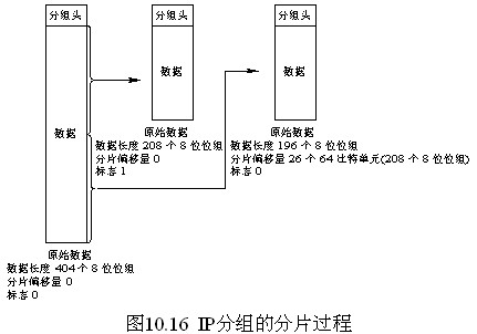 IP分組格式中,分片偏移量和標志字段用來對IP分組的分片與重裝,分片過程如圖10.16所示。