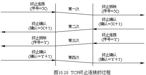 (2) TCP連接的拆除。由于TCP連接是一個全雙工的數據通道,一個連接的關閉必須由通信雙方共同完成。當通信的一方沒有數據需要發送給對方時,可以使用終止連接(FIN)向對方發送關閉連接請求。這時,它雖然不再發送數據,但并不排斥在這個連接上繼續接收數據。只有當通信的對方也遞交了終止連接的請求后,這個TCP連接才會完全關閉,如圖10.20所示。