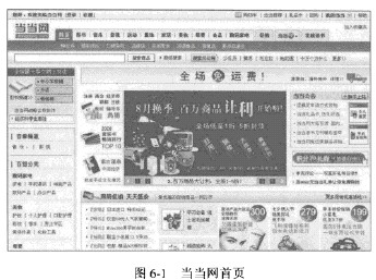當當M(http://www.dangdang.com,首頁如圖6-1所不)是一個“純網絡”型網上商店,1999年11月正式開通。當當M成立以來,每年均保持100%的卨速成長,2009年成長率高達120%。當當網在線銷售的商品包括了家居百貨、化妝品、數碼、家電、圖書、音像、服裝及母嬰等幾十個大類,逾百萬種商品,在庫圖書達到60萬種。目前,每年有近千萬客戶成為當當M新增注冊用戶,遍及全國32個省、市、自治區和直轄市。每天有上萬人在當當網買東兩,每月有3000萬人在當當W瀏覽各類信息,當當網每月銷售商品超過2000萬件。