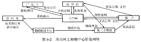 在當當網上購物中心商務模式中,涉及的利益相關者主要包括供應商、物流配送中心、店屮店店主、第三方物流、廣告主和客戶,其價值網絡如圖6-2所示。