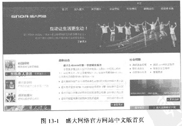 上海盛大網絡發展有限公司(http://www.shanda.com.cn,首頁如圖13-1所不,以下簡稱盛大網絡)成立于1999年11月,是中國互動娛樂媒體企業,公司致力于通過互聯網為用戶提供多元化的娛樂服務。盛大網絡為用戶提供一系列目前最受歡迎的大型多人網絡游戲、休閑益智游戲與在線競技游戲,同時提供動漫、文學、音樂等豐富的相關娛樂內容。盛大網絡通過強大的游戲運營能力、周到的客戶服務能力、完善的技術保障與支持能力、廣泛的銷餌網絡和健全、高效的支付平臺,形成了面向用戶的綜合性互動娛樂平臺。該平臺凝聚了龐人的用戶群體,各年齡層的玩家均可以借由盛大網絡互動娛樂平臺與其他成千上萬的玩家進行互動,體驗互動娛樂帶來的樂趣。2004年5月,盛大互動娛樂有限公司在美國納斯達克股票市場成功上市,成為國內第一支在美國上市的網絡游戲公司,并一舉成為全球居地位的網絡游戲公司。截至2009年4盛大網絡擁冇的累計注冊用戶數超過8億。