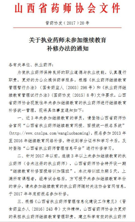 近3年為參加山西執業藥師繼續教育的學員,可以登錄山西省藥師協會網站“山西省執業藥師繼續教育網授、面授統一報名系統”進行補修,具體辦法如下: